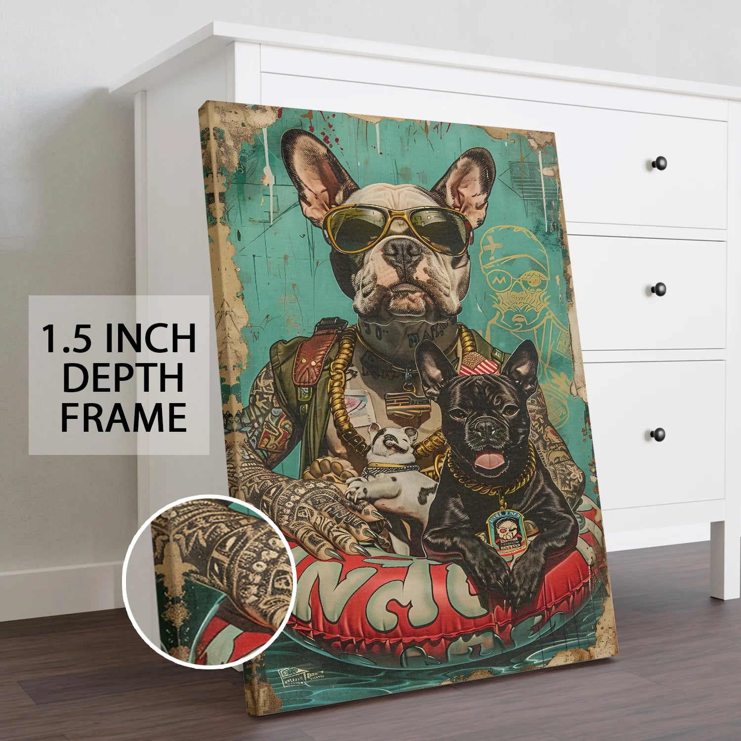 Add attitude and humor to your space with this Funky Bulldog Graffiti Canvas Wall Art Painting. Featuring a stylish bulldog decked out in shades, tattoos, and gold chains, this Funky Bulldog Graffiti Canvas Wall Art Painting blends street art with playful charm. Perfect for modern homes, cafés, or studios, this Funky Bulldog Graffiti Canvas Wall Art Painting brings bold personality and urban flair to any wall.